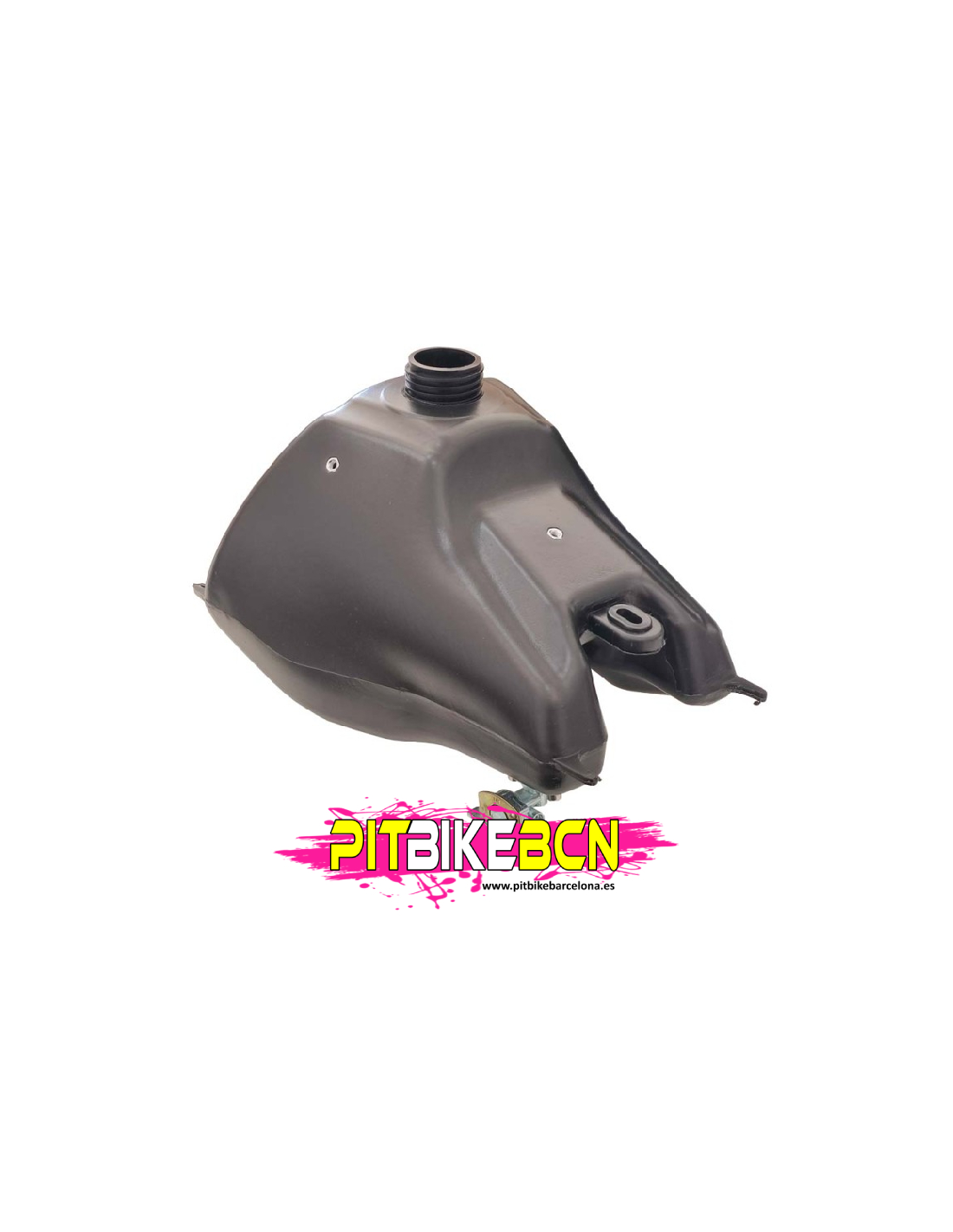 El depósito para pit bikes formato CRF70 cuenta con fijación trasera central al chasis, ofreciendo una sujeción firme y segura. Es compatible con modelos como MALCOR RACER o REBEL MASTER POLE.
