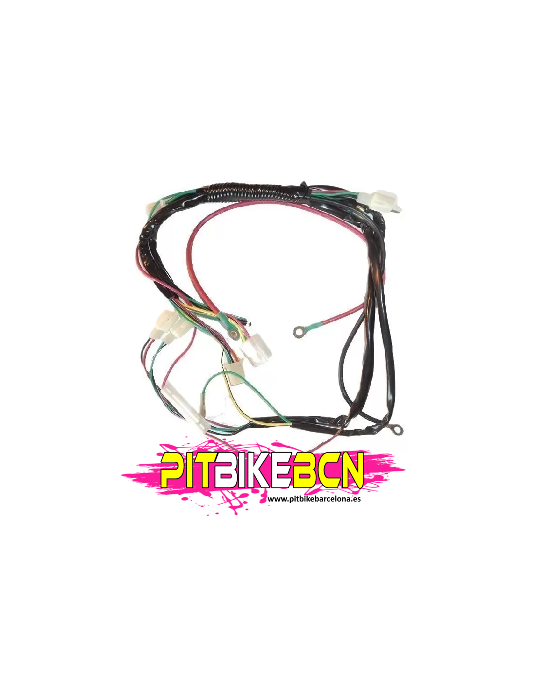 Cables para pit bikes con arranque a batería, incluyendo conexiones para la batería, pulsador de arranque, CDI y bobina, todo lo necesario para instalar y montar.