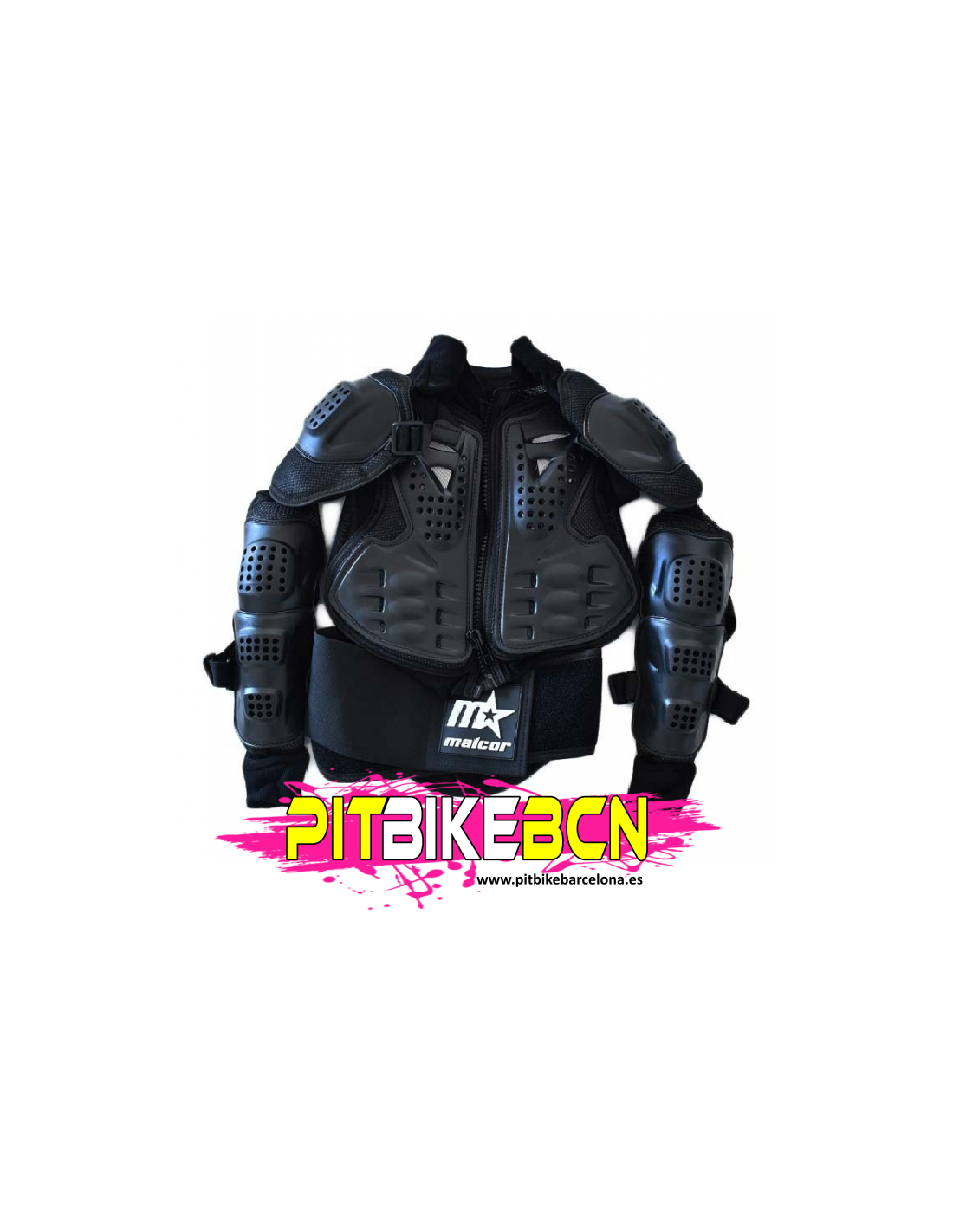 Protector peto integral infantil para motocross, con protecciones en pecho, dorsales, hombros, brazos, antebrazos, codos y muñecas.