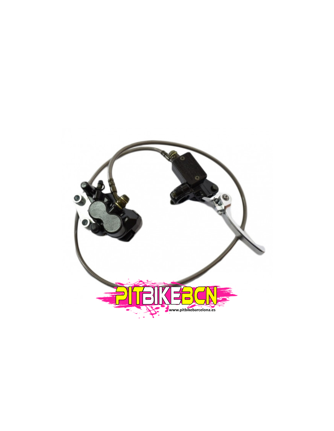 El sistema incluye maneta anti-rotura, latiguillo, bombín, pastillas y, según disponibilidad de stock, el soporte de horquilla. La medida entre ejes para la horquilla es de aproximadamente 44-45 mm, adaptándose a la mayoría de horquillas estándar de pit bikes.
