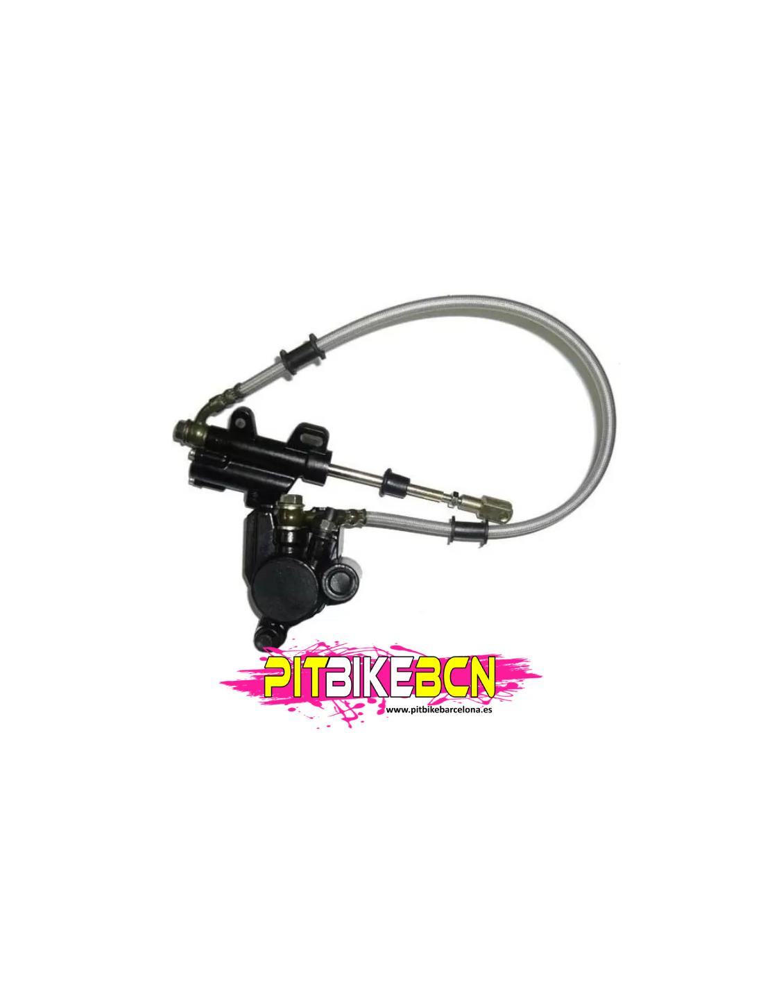 Freno trasero simple de pistón grande para pit bikes, concentrando toda la fuerza en el centro para una frenada más fina y controlada. Kit completo con pinza y bomba de freno, listo para montar.