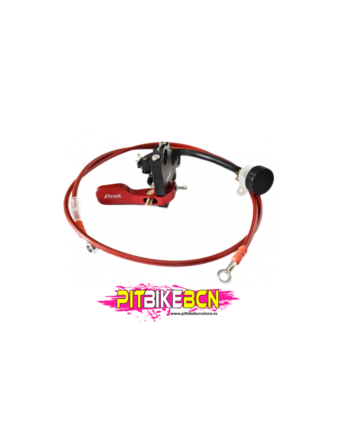 Fabricado con materiales de alta calidad, este sistema incluye una bomba de freno XFRONT con depósito para líquido de frenos, junto con una leva y soporte anodizados en color rojo y un latiguillo hidráulico de 1650 mm de longitud. Todo el conjunto está listo para instalar en la mayoría de modelos de pit bike del mercado, ofreciendo un rendimiento inmediato y fiable.