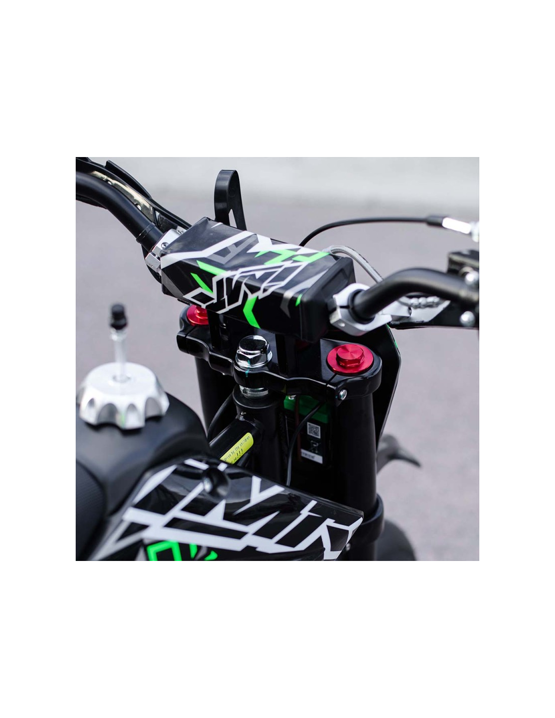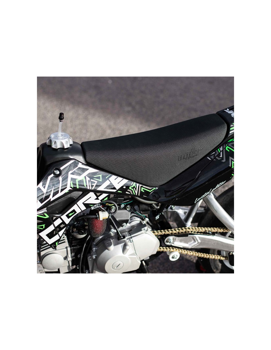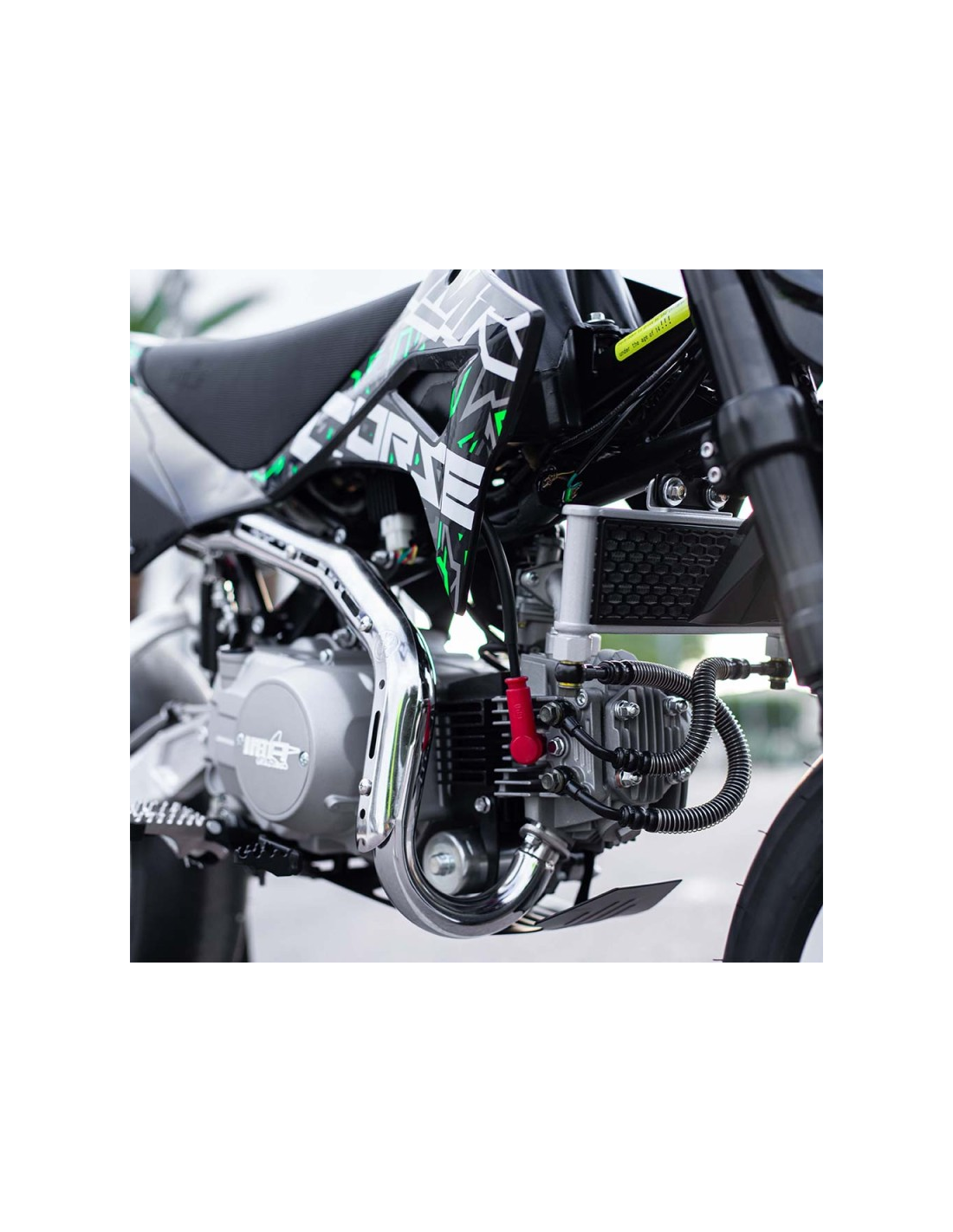 Nueva Pitbike IMR Corse con motor de 4 tiempos y 110cc, refrigerado por aire y aceite. Ofrece 6,5 CV de potencia, con cambio automático y arranque eléctrico para mayor comodidad.