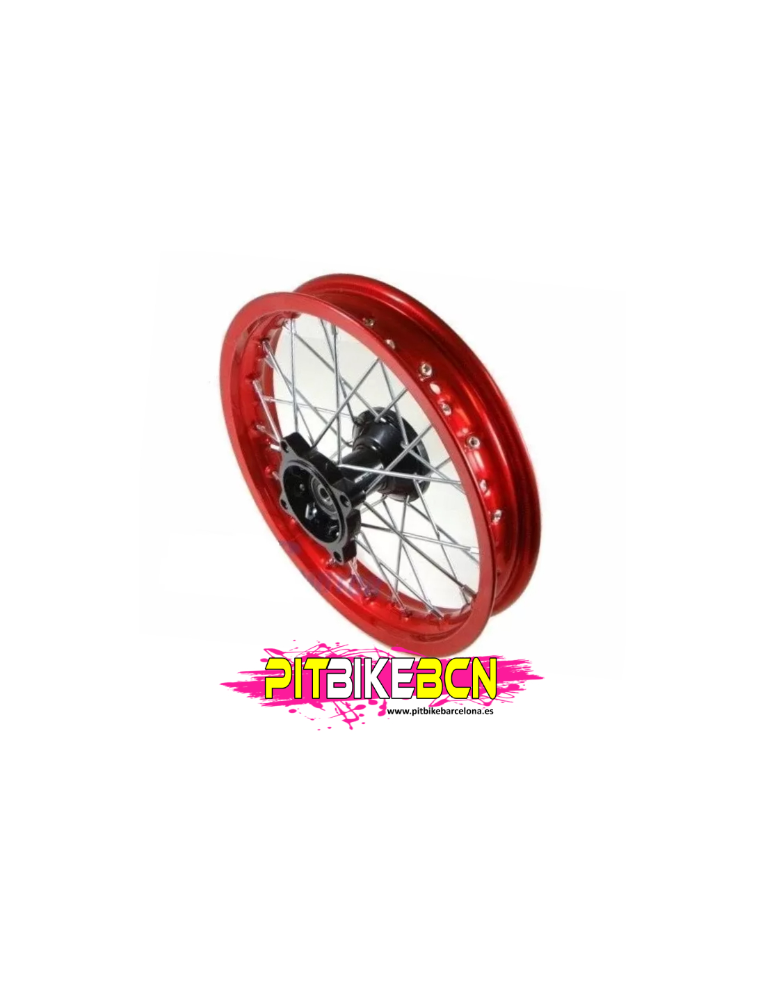 Llantas de cross en aluminio, color rojo anodizado con bujes de acero negro. Disponibles en trasera 12x1,85 y delantera 14x1,40. Más resistentes que las de acero y con mejor centrado.