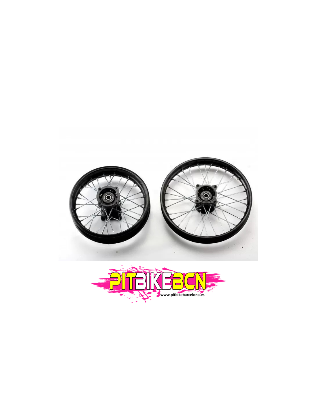 Llantas de hierro endurecido 17" delantera y 14" trasera para pit bikes de cross. Material resistente que ofrece mayor rigidez y durabilidad que las llantas de aluminio.