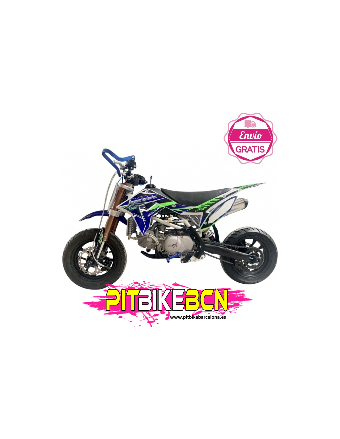 Descubre la MALCOR RACER R, una minimotard cargada de extras lista para dominar la pista. Equipamiento completo: palanca de cambio de aluminio azul, estriberas recortadas, cadena KMC dorada y puños Protaper para un agarre óptimo.