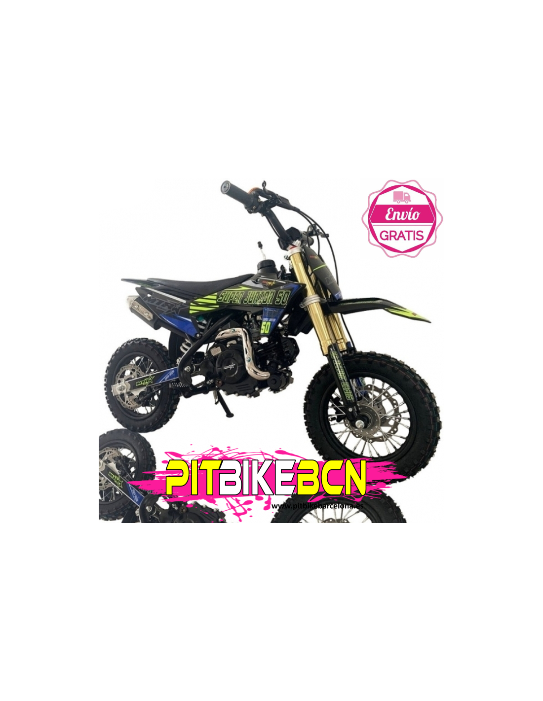 Equipada con ruedas de 10 pulgadas delanteras y traseras, esta pit bike es ligera y manejable, con velocidad máxima de 45-50 km/h. Su horquilla invertida de 550mm y amortiguador trasero de 270mm garantizan estabilidad y confort.